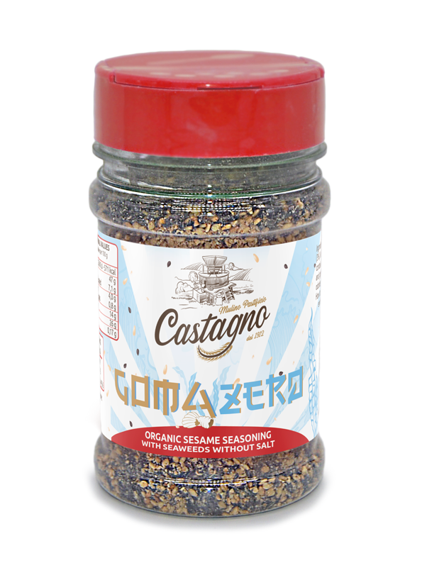 Ingredienti: Semi di sesamo (95.5%), mix di alghe essiccate in proporzione variabile (4.5%) (Nori, Kombu)