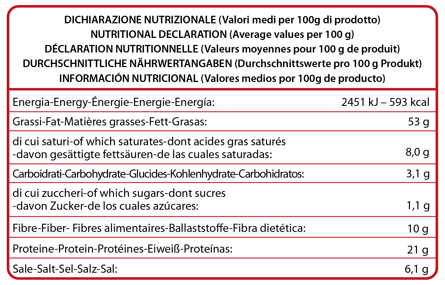 Ingredienti: Semi di sesamo (94,1%), sale marino, mix di piante aromatiche in proporzione variabile (1,9%) (salvia, cipolla, prezzemolo, basilico)