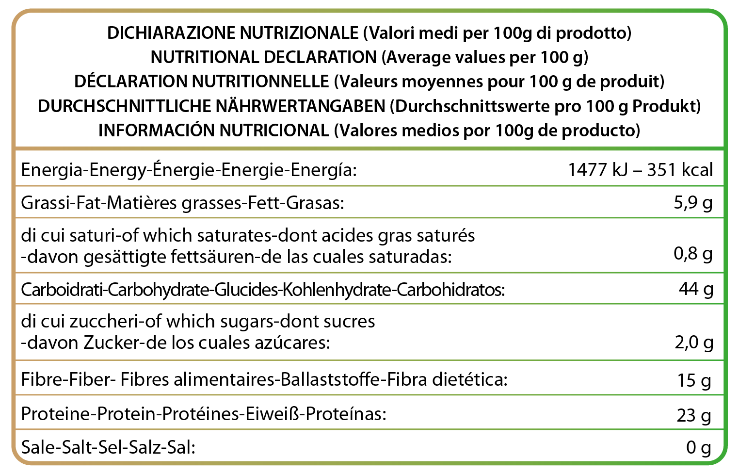 Ingredienti: Farina di ceci* (94%), broccoli* disidratati (5%), aglio* disidratato. *Ingrediente biologico.