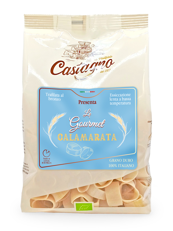 La pasta calamarata, detta anche mezze maniche, è un formato tipico della cucina campana, la cui forma ad anelli spessi prende il nome proprio dal calamaro, o totano, che rappresenta il condimento principale nella ricetta napoletana. Difatti questa pasta si presta bene per i primi piatti con pesce ed è ideale per le grandi occasioni.
