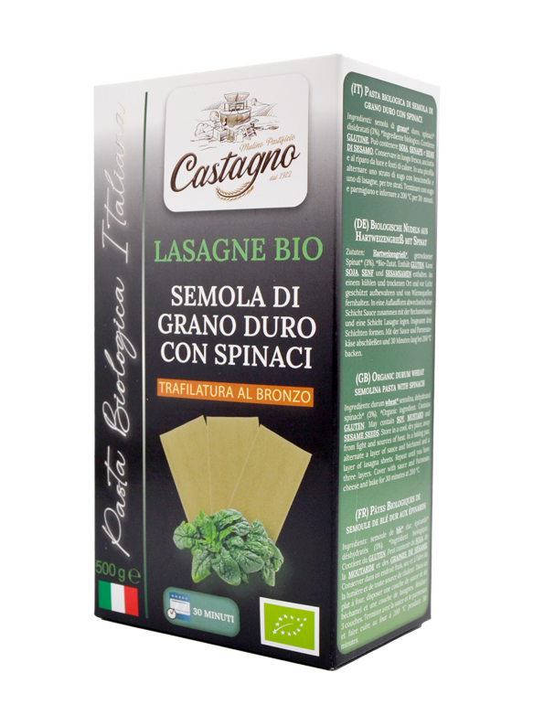 Preparazione e cottura: Le lasagne sono pronte all’uso e non necessitano di precottura. Condire con un sugo e/o una besciamella molto liquida. Infornare a 220°C per 20 minuti.